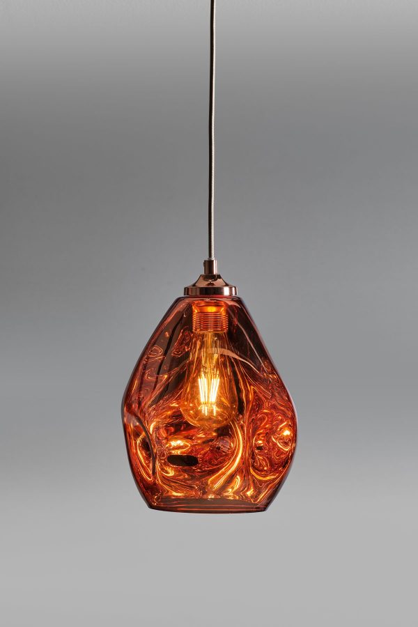 Die Pendelleuchte aus Glas ist eine höheneinstellbare Leuchte mit einer maximalen Pendellänge von 200 cm. Sie verfügt über E27-Fassungen und kann mit herkömmlichen Halogen-Leuchtmitteln oder LED-Retrofit Leuchtmitteln betrieben werden. Der Durchmesser des Schirmes der Pendelleuchte beträgt 20 cm, die Höhe 23 cm. Die Pendelleuchte ist erhältlich in den Farben gold, bronze, silber und platin.