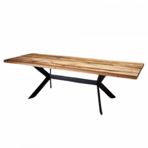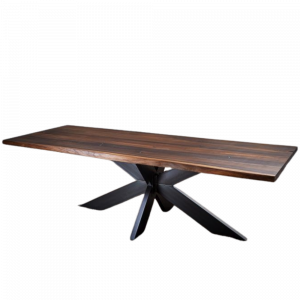 Ein echter Blickfang für Ihr Esszimmer: Unser Esstisch Meschede mit Schweizer Kante wirkt massiv und schlank zugleich! Die ca. 3 cm starke, massive Eichenplatte wird in verschiedenen Ausführungen angeboten: Abgebildet sehen Sie die Bearbeitung mit „Rohholz-Effekt-Lack“. Die Eichenplatte wirkt natürlich und unbearbeitet. Die Astlöcher sind offen. Gern bieten wir auch eine schwarze Spachtelung oder Zinneinlagen an. Kontrastreich ist das Tischgestell in schwarz. Die Formgebung ist auch hier rund und harmoniert perfekt zur abgerundeten Tischplatte. Dieses Modell bieten wir auch in diesen Maßen an: 200 x 100 cm und 220 x 100 cm.