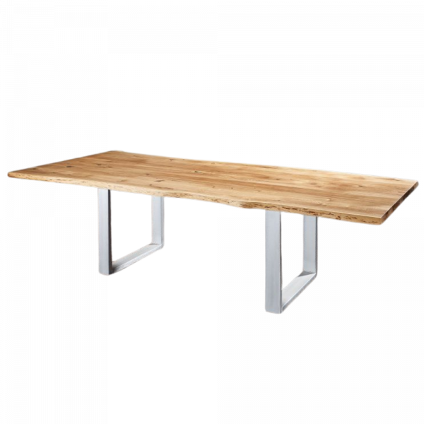Wir fertigen Baumkanten-Esstische nach Maß: Eichen-Esstische mit natürlicher Baumkante sind modern und zeitlos. Gern stimmen wir die Maße Ihrer vorhandenen Einrichtung an. In der Abbildung zeigen wir den Esstisch Arnsberg mit einer Länge von 240 cm. Durch die Baumkante variiert die Esstisch-Breite zwischen 98 cm und 110 cm. Selbstverständlich kann der Esstisch auf Wunsch auch schmaler angefertigt werden. Unser Modell Arnsberg hat eine 4 cm starke Tischplatte. Abgebildet sehen Sie eine geölte Tischplatte mit schwarzer Spachtelung. Diese Optik ist sehr natürlich und beliebt. Zudem bieten wir alternativ Zinneinlagen in den Astlöchern an. Abstrakte Edelstahl-Kufen dienen als Tischbeine. Dieses Gestell ist auch in schwarz lieferbar!