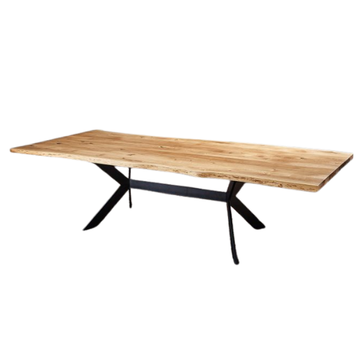 In unserer Manufaktur im Sauerland fertigen wir Esstische nach Maß. Esstische mit einer natürlichen Baumkante erfreuen sich großer Beliebtheit. Abgebildet sehen Sie eine Eichenplatte in 240 cm Länge und 4 cm Stärke. Die Tischplatte ist geölt, die Astlöcher und Risse sind schwarz gespachtelt. Ein X-Gestell mit Quertraverse in schwarz trägt die massive Baumkanten-Platte. Dieses Gestell ist auch in Edelstahl lieferbar! Wählen Sie die Maße sowie die Tischbeine (Gestell) nach Wunsch – angepasst an Ihre vorhandene Einrichtung.