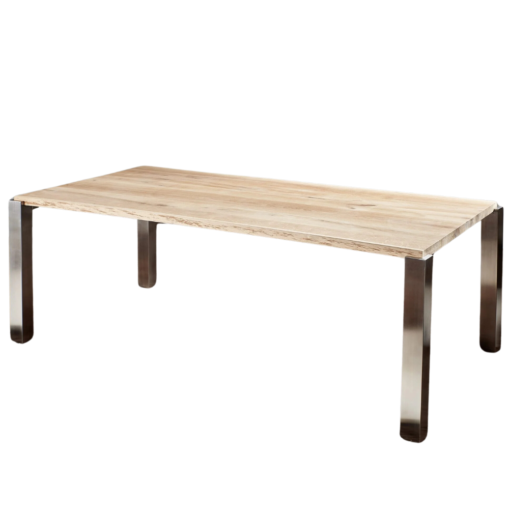 Suchen Sie einen besonderen Esstisch mit Baumkante? In unserer Manufaktur im Sauerland werden Baumkanten-Esstische nach Kundenwunsch angefertig. Unsere Esstische mit Naturkante sind zeitlos und modern. In der Abbildung sehen Sie das Modell Arnsberg in einer Länge von 220 cm. Die Tischbreite variiert durch die „kurvige“ Baumkante zwischen ca. 96 cm und ca. 106 cm. Die Tischbeine sind aus Edelstahl. Diese sind auch in schwarz lieferbar. Gern passen wir die Esstisch-Maße Ihrer vorhandenen Einrichtung an: Wir fertigen kleinere Maße wie z.B. 160 cm x 80 cm oder 180 cm x 90 cm, 200 cm x 100 cm oder 240 cm x 100 cm. Die Tischplatte ist hier ganz im „Natur-Look“: Die Astlöcher sind offen und die Oberfläche hat den natürlichen Rohholz-Effekt. Diese ist eine Lackierung. Im Gegensatz zu geölten Tischplatten, ist diese hier heller. Wählen Sie nach Wunsch (Preis identisch wie geölt)!