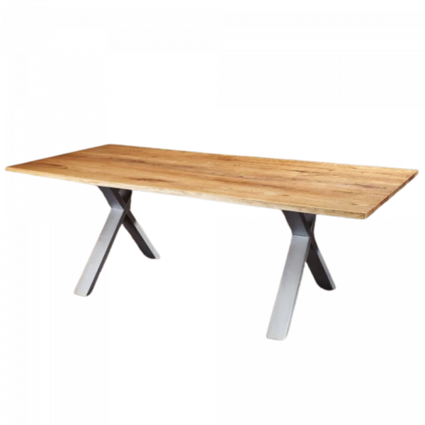 Suchen Sie einen wunderschönen Esstisch aus Eichenholz mit natürlicher Baumkante? Unser Modell Plettenberg hat eine Tischplatte aus massiven Eichenbohlen, die 3 cm stark sind. Auf der Unterseite verstärken Entlastungsrillen die Platte. Die Astlöcher sind schwarz gespachtelt und unterstreichen so die Natürlichkeit des Tisches. Zudem ist die Oberfläche geölt. Wir bieten Ihnen verschiedene Optiken an: Kunden haben zum Beispiel auch den Wunsch, dass Astlöcher offengehalten werden oder aber Risse und Astlöcher mit Zinneinlagen gefüllt werden. Passend zu Ihrer Einrichtung und ganz nach Ihren Vorstellungen, finden Sie hier hochwertige Edelstahl-X-Beine, die eine schlichte Eichen-Tischplatte tragen. Diese Tischbeine sind erschwinglich, zeitlos und auch sehr praktisch – Beine und Knie haben absolute Freiheit ohne Berührungspunkte oder schmerzhaftes Anstoßen. Wählen Sie aus der großen Auswahl an edlen X-Beinen. Die Beine gibt es ebenfalls in Schwarz oder Dunkelgrau. Alternativ zeigen wir Ihnen weitere Tischbeine auf den anderen Abbildungen dieser Produktseite.